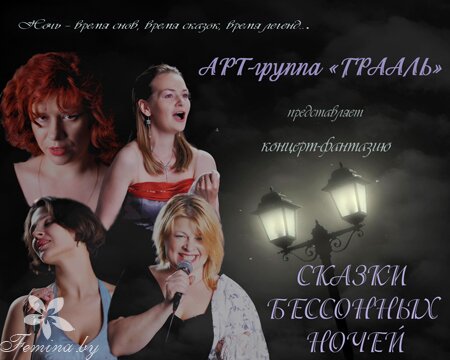 Однако, поскольку проект требовал больших финансовых вложений его пришлось отложить до лучших времен, которые, как мы надеемся, уже не за горами. Мы остановились на более скромном по финансовым затратам проекте ?Сказки бессонных ночей?, с которым группа в данное время ведет активную концертную деятельность. Так заразительная идея объединила пять человек, и превратилась в коллектив с замечательным названием - АРТ-группа ?Грааль?.